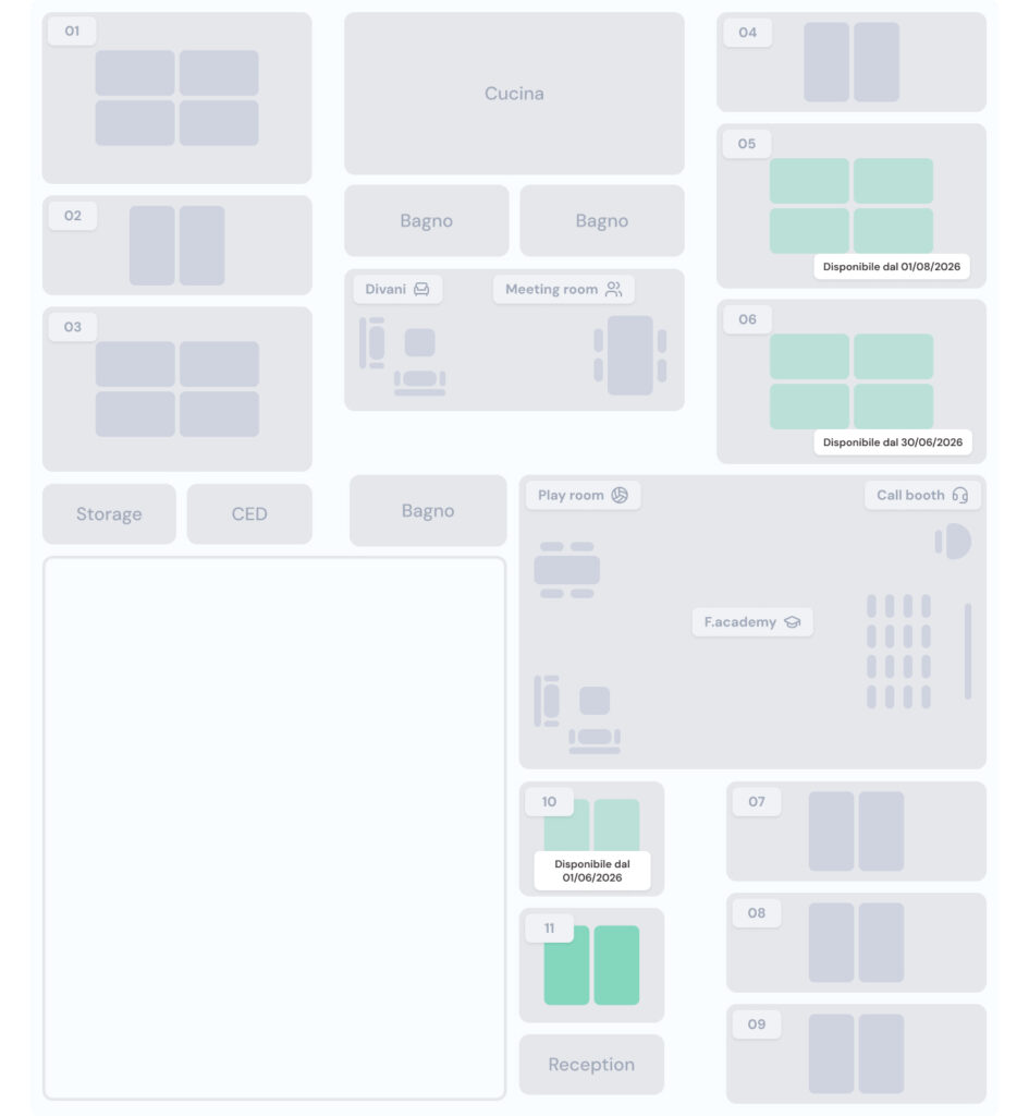 Scopri gli spazi di Hub in modo interattivo. Muoviti liberamente stanza per stanza, esplora gli uffici, le aree comuni e i servizi disponibili per trovare la soluzione più adatta alle tue esigenze.